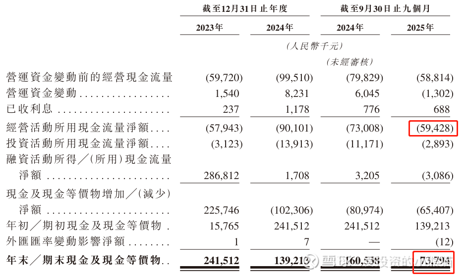截至2025年9月30日,公司账上现金有人民币0.74亿元,经营活动现金流为-0.59亿元。