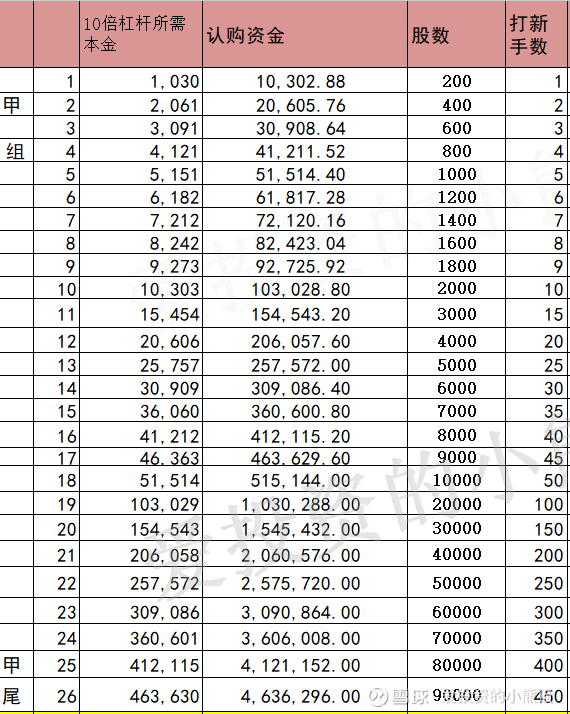 甲组的各档融资所需要的本金还有融资金额对应如下表: