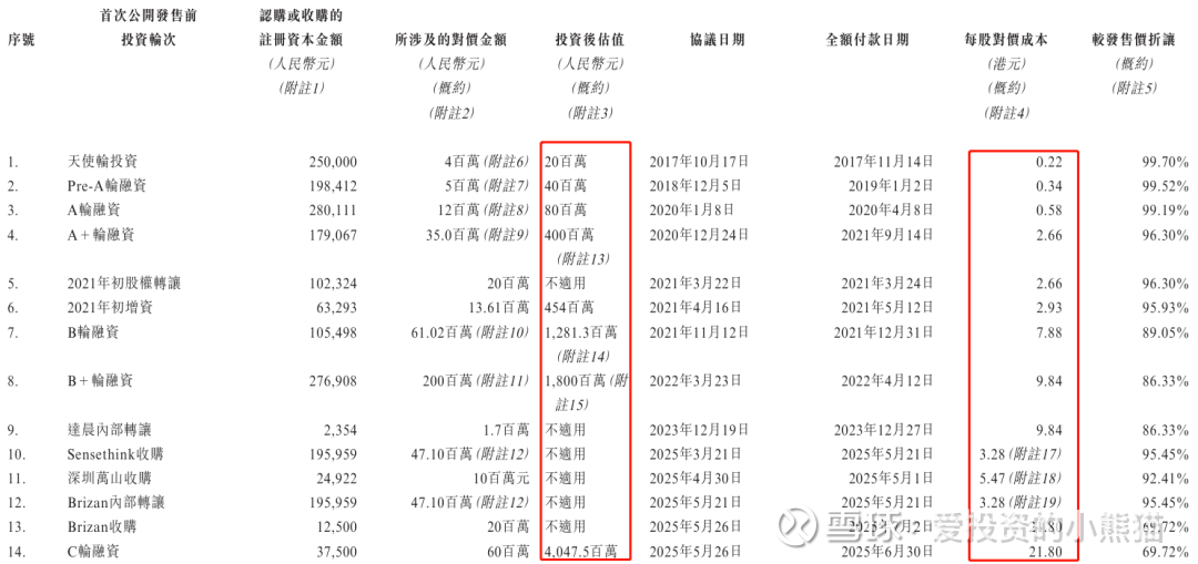 2023年建晨内部转让的每股对价与B+轮一致为9.84港元,折让86.33%;2025年多项资产收购中,Sensethink收购、Brizan内部转让的每股对价均为3.28港元,折让95.45%,深圳嵩山收购每股对价5.47港元,折让92.41%,Brizan收购每股对价21.80港元,折让69.72%;2025年C轮融资,投后估值大幅增至40.48亿元人民币,每股对价与Brizan收购一致为21.80港元,折让69.72%。