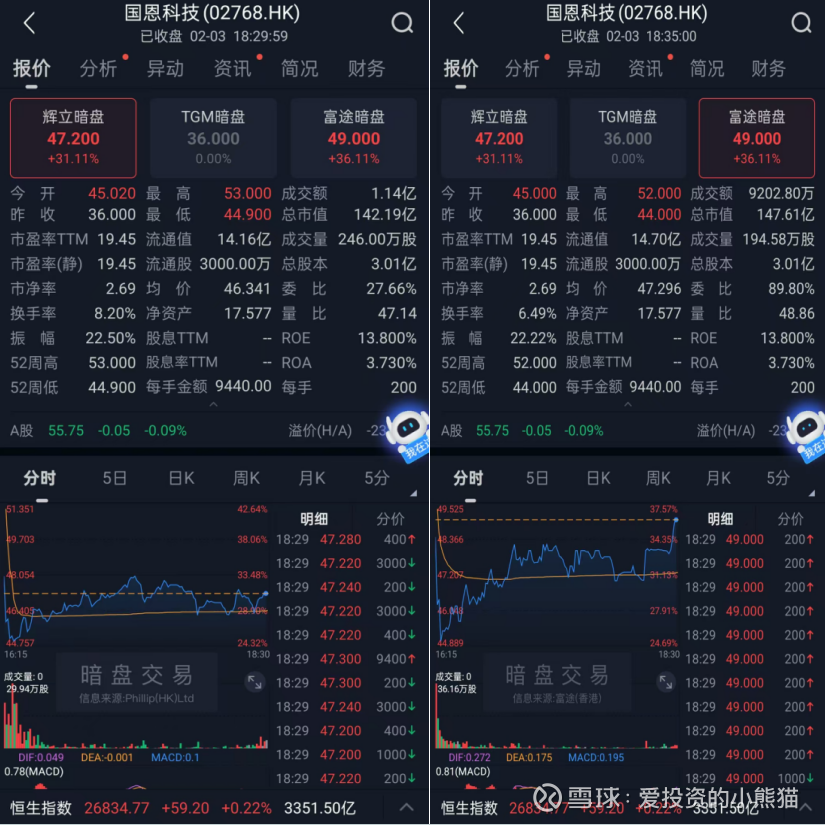 2026年2月4日,国内化工新材料龙头$国恩科技(02768)$ 正式登陆香港联交所主板,上市首日表现亮眼,开盘即迎来大幅高开,报45港元,较36港元的发行价大涨25%,开市时段成交756.74万股,市场认购热情迅速升温 。开盘后,股价延续上行趋势,盘中一度涨超40%,截至发稿时(13时40分),股价报43.42港元,涨幅约20.61%,成交额达9.5亿港元,总市值约130.8亿港元。