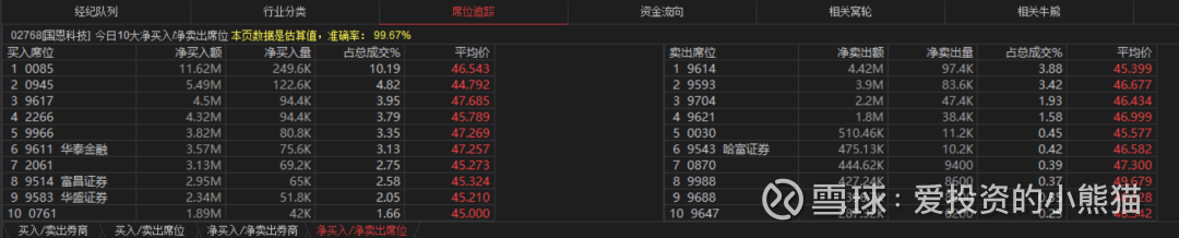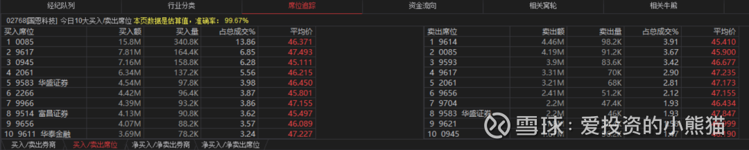 国恩科技(02768.HK)买盘席位有0085、0945、9617、2266等,卖盘第一席位是9614。
