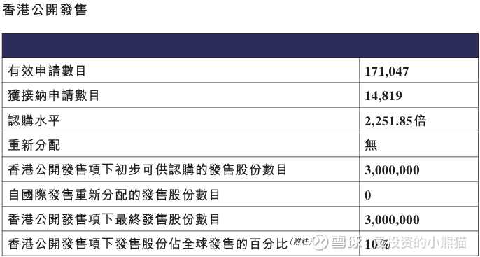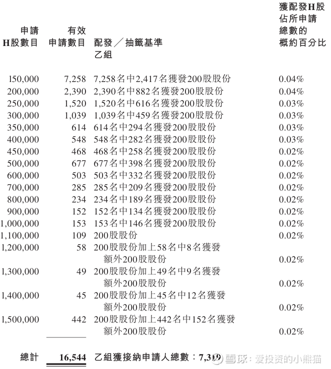 配售情况:171047人认购,这次公配2251.85倍,由于机制B分配,无回拨比率,国配有10.03倍,一手中签率2.00%,认购5500手稳中1手,同时乙组16544人申购,其中顶头槌申购442张,获配率0.02%-0.04%。