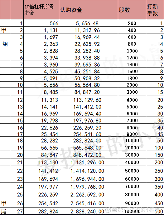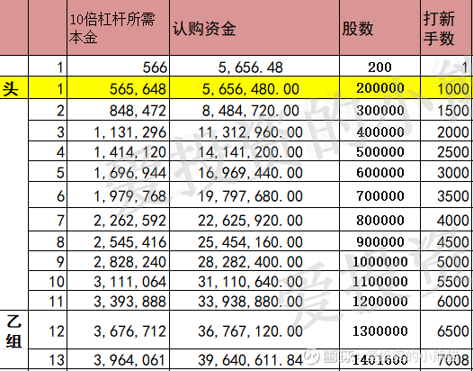 这个票甲尾283万,乙头需要认购资金566万,乙组的各档融资所需要的本金还有融资金额对应如下表: