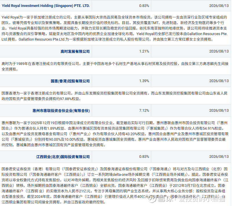 5. 江西铜业(北京)国际投资有限公司(认购占比0.83%):江西铜业集团旗下专业投资平台,围绕铜产业生态圈开展股权投资与资本运作,具备深厚的产业资源整合能力。