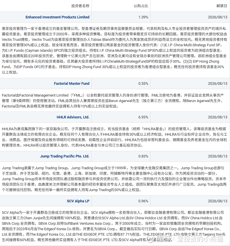 7. Jump Trading Pacific Pte. Ltd.(认购占比0.83%):国际知名高频交易机构Jump Trading的新加坡子公司,拥有量化交易及全球资产配置能力,是具备成熟市场经验的专业投资主体。