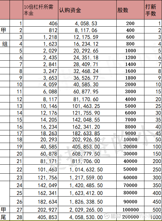 甲组的各档融资所需要的本金还有融资金额对应如下表: