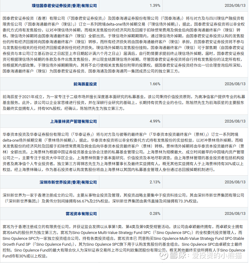 认购占比4.99%,是国内头部私募资产管理机构,以深度研究驱动价值投资,业务覆盖A股、港股及美股中概股,凭借稳健业绩与风控能力,吸引了主权财富基金、养老基金等大型机构投资者长期跟随。