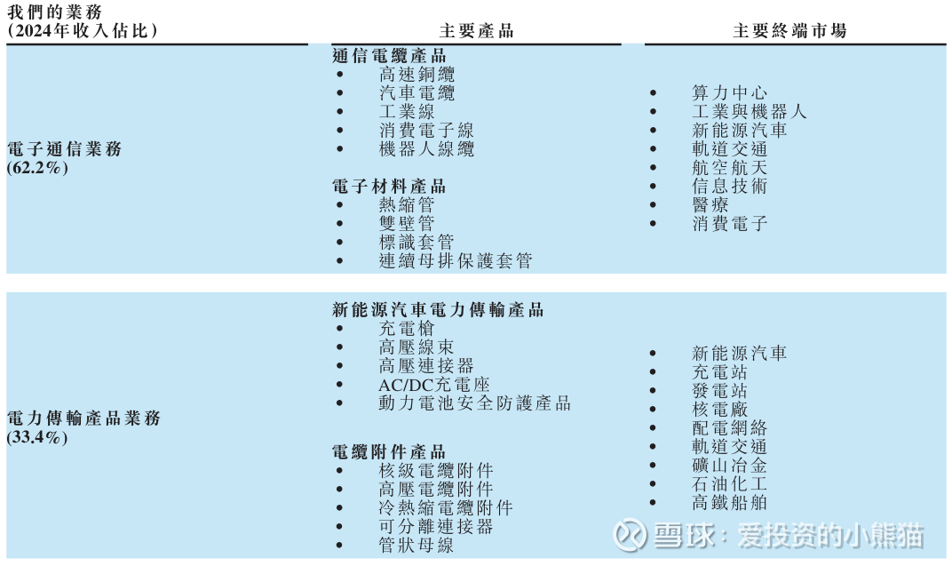 沃尔核材是全球领先的电子通信与新能源电力传输综合解决方案提供商,核心业务覆盖三大板块:电子通信领域聚焦高速铜缆、消费及工业线缆等通信电缆产品,以及以热缩材料为核心的电子材料研发制造(热缩材料占电子材料收入绝大比重);电力传输领域主打新能源汽车充电类产品、动力电池安全防护产品,及核级热缩、高压冷热缩等电缆附件;同时布局风力发电等其他业务。