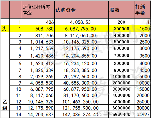 乙头需要认购资金609万,乙组的各档融资所需要的本金还有融资金额对应如下表:
