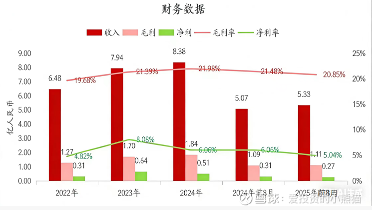 收入分别约为人民币6.48亿元、7.94亿元、8.38亿元、5.07亿元、5.33亿元,2025年前8月同比+5.11%;