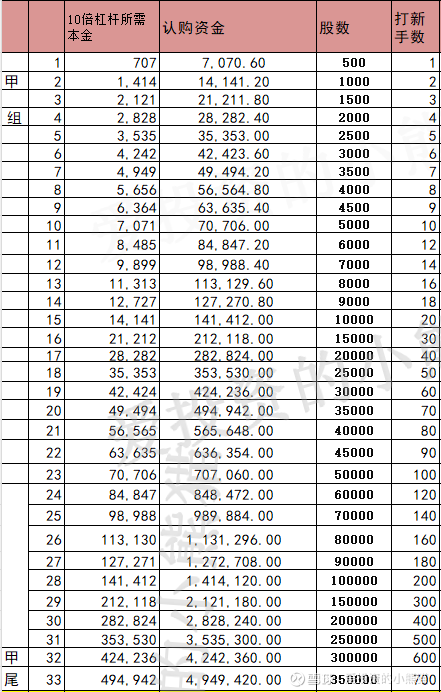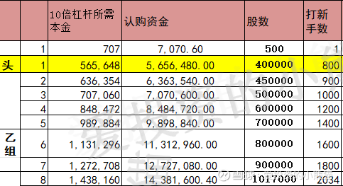 这个票甲尾495万,乙头需要认购资金566万,乙组的各档融资所需要的本金还有融资金额对应如下表: