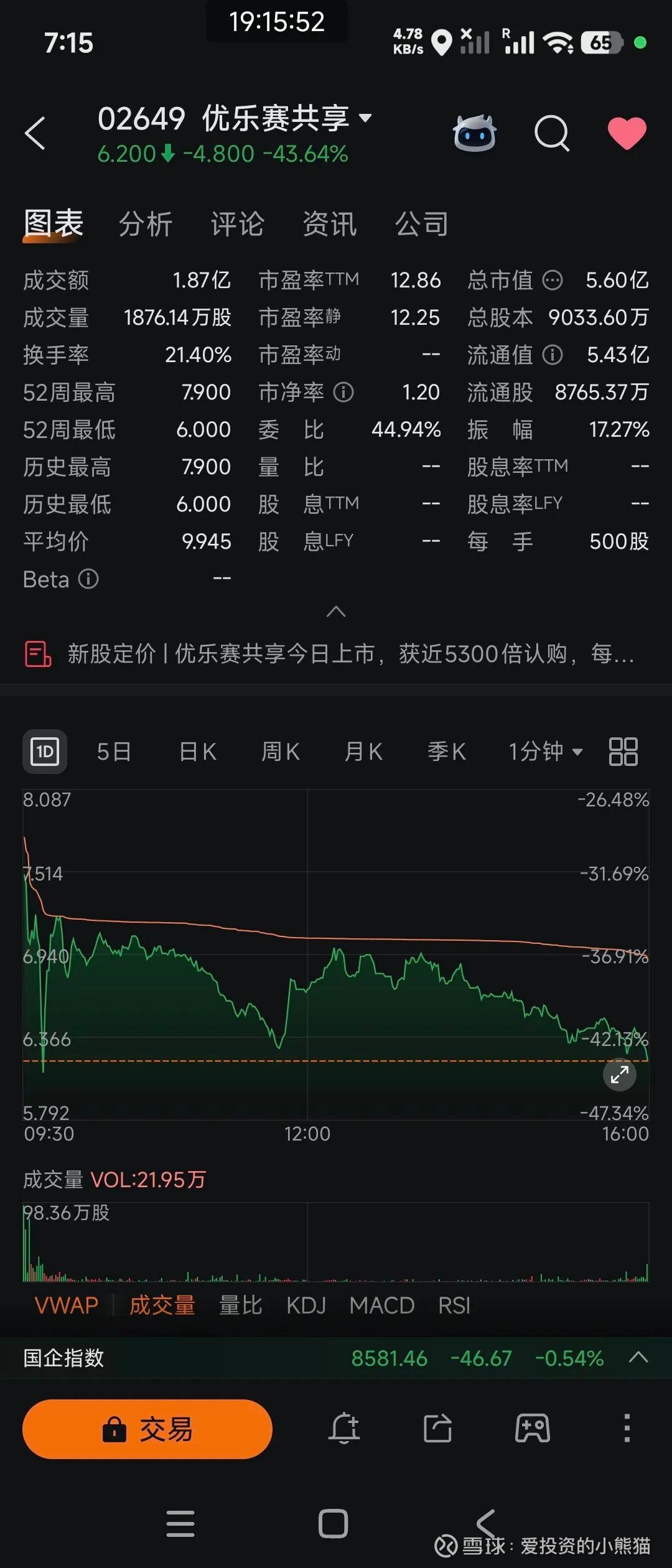 收盘惨淡:截至收盘,股价报6.20港元,较11.0港元的发行价暴跌43.64%。以一手500股计算,账面亏损高达2400港元(不计手续费)。