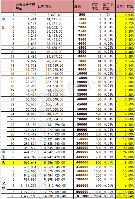 有294人中签300股,有75人中签400股,有267人顶头槌认购中签400股,有50人顶头槌认购中签500股。