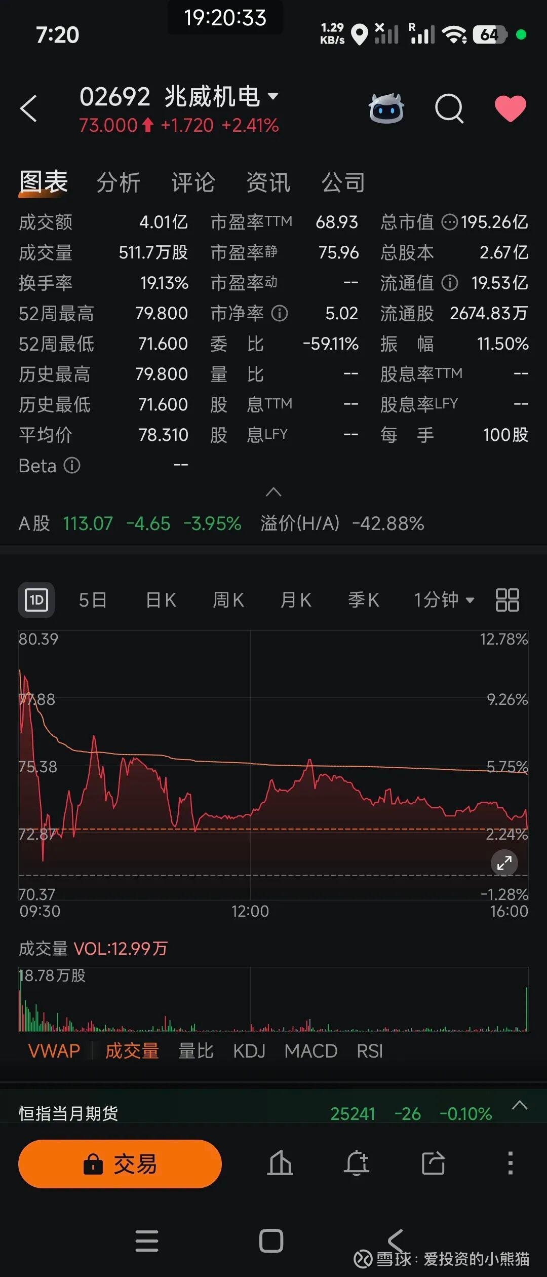 兆威机电(02692.HK)发行价71.28港元,首日开盘表现强劲,报78港元,较发行价上涨9.43%,最高摸到79.80港元,随后受获利盘兑现影响股价震荡回落,午盘后维持在73港元附近整理,最终全日收于73港元,较发行价微涨2.41%,在三只新股中独录得上涨。比起暗盘也是差了很多。也是赶上a股大跌。