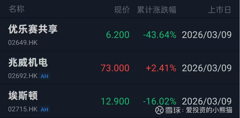 3月9日,$优乐赛共享(02649)$、$兆威机电(02692)$ 、$埃斯顿(02715)$ 三只新股同日于港交所挂牌上市,股价表现分化明显,仅兆威机电首日收涨,优乐赛共享大破发,