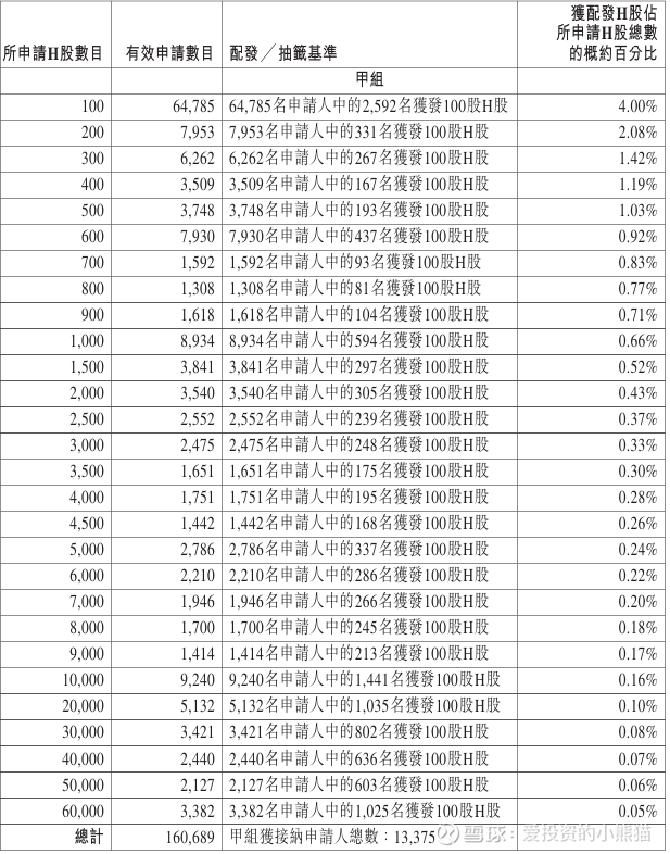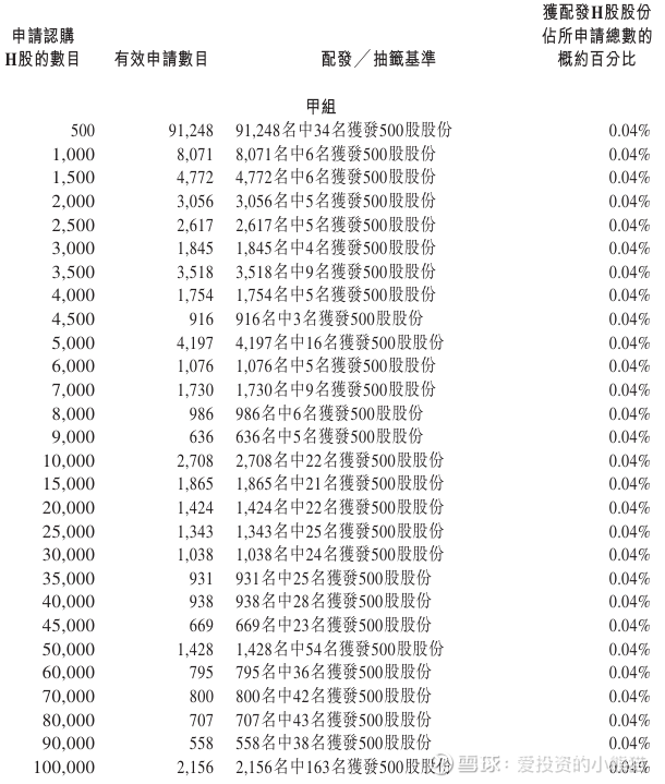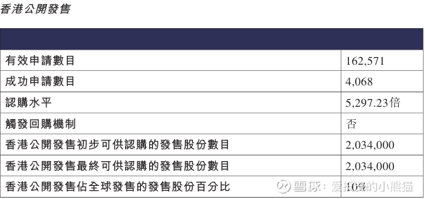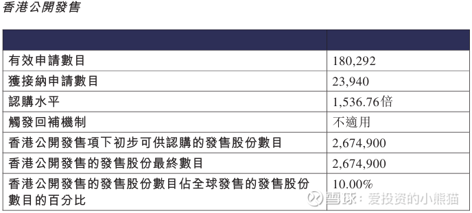 配售情况:180292人认购,这次公配1536.76倍,由于机制B分配,无回拨比率,国配有13.40倍,一手中签率4.00%,认购3000手稳中1手,同时乙组19603人申购,其中顶头槌申购317张,获配率0.03%-0.05%。