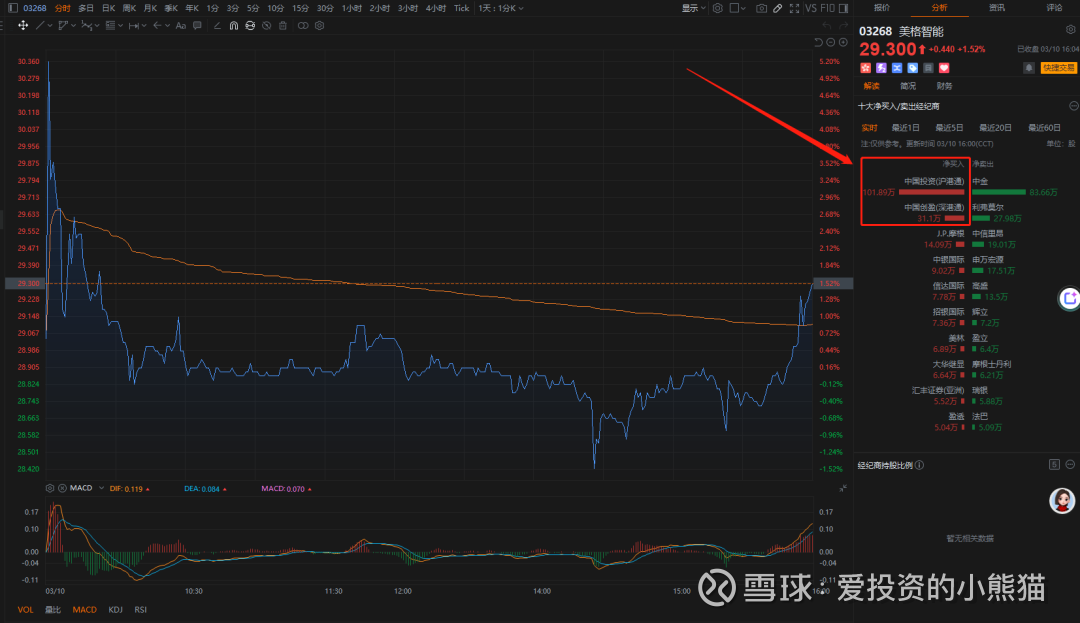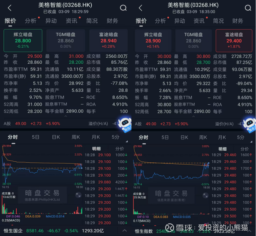 $美格智能(03268)$ (3月10日,03268.HK)发行价:28.86港元,首日开盘价29.04港元,较发行价涨0.62%,冲高至30.66港元(+6.24%),随后回落震荡,收盘价29.30港元,较发行价涨1.52%,总市值约86.95亿港元。A股(002881.SZ)收49.14元人民币,H股较A股折价约47%。