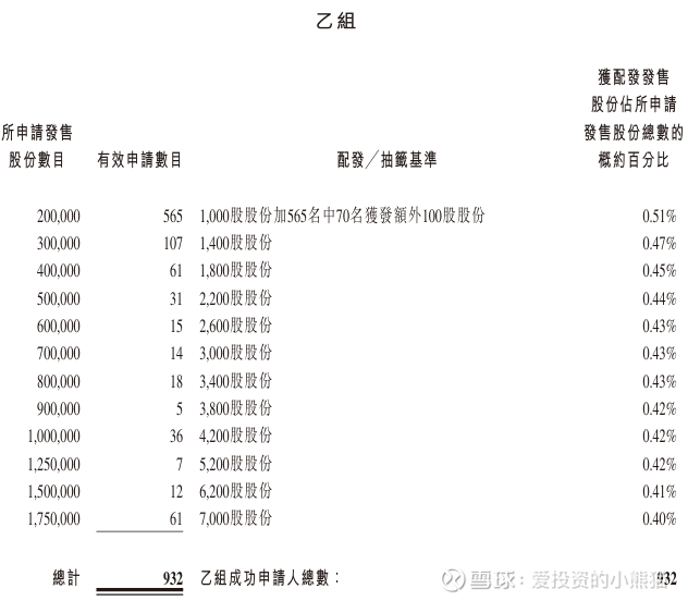 乙组有932人中签,总共中签175万股,货值5051万港元。顶头槌货值20.20万港元,