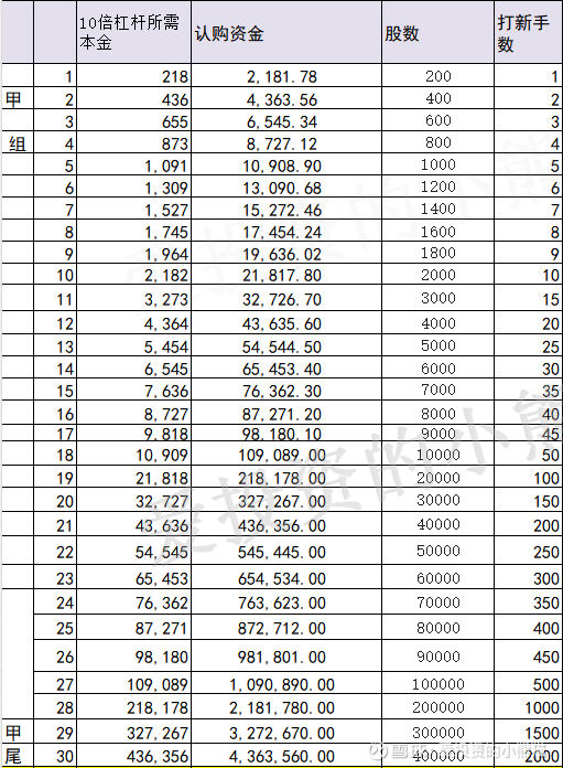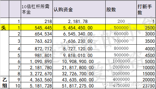 这个票甲尾437万,乙头需要认购资金546万,乙组的各档融资所需要的本金还有融资金额对应如下表: