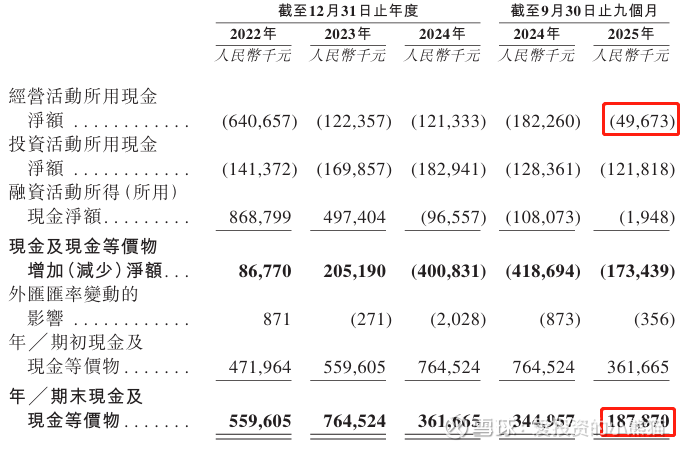 截至2025年9月30日,账上现金约人民币1.88亿元,营运资金变动前的经营现金流为-0.50亿元。