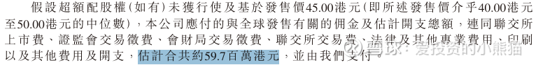 然后这个票招股书上按发售价范围的中位数45.00港元计算,公开的上市所有开支总额约为5970万港元,募资额约5.40亿港元,占比约11.06%,开支相比募资额算是一般化了。