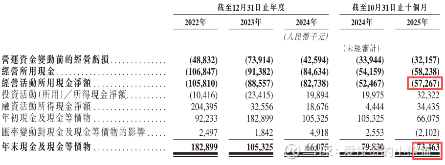 截至2025年10月31日,账上现金约人民币0.73亿元,经营现金流为-0.57亿元。