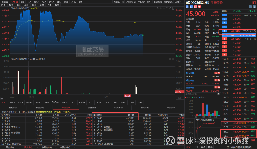 两个规模差不多,傅里叶募资规模更小,但是回拨20%,给散户的筹码是更多了。泽景就是被国配砸盘给砸死了。泽景股份(02632.HK)买盘席位有0988、9523、2266、0049等,暗盘卖盘第一席位是9640,暗盘国配就9640
