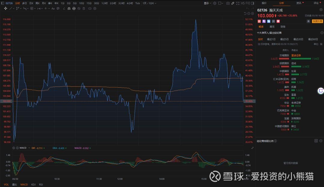 $瀚天天成(02726)$ 发行价76.26港元,开盘价110.00港元,涨幅44.24%,最高摸到116.00港元,收盘价103.00港元,涨幅35.06%,走势稳健。