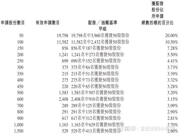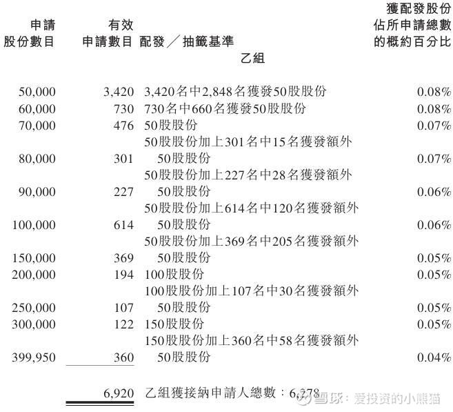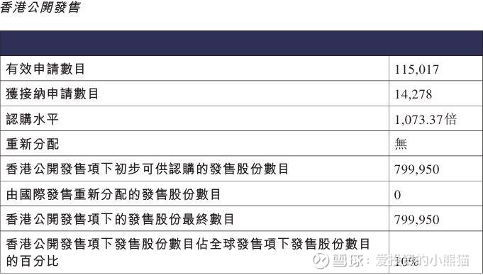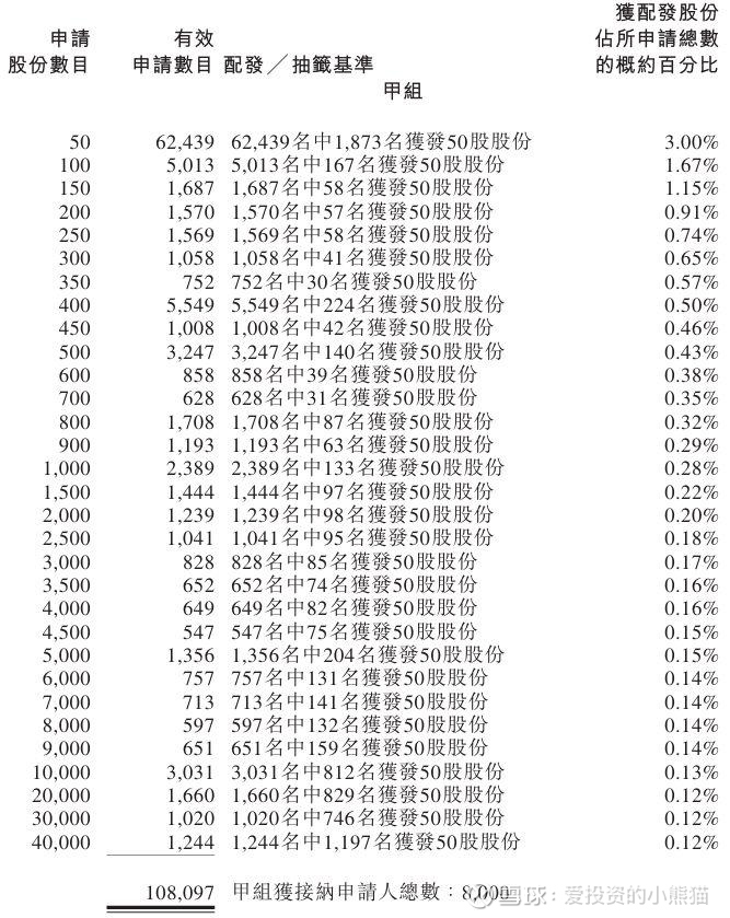 配售情况:115017人认购,这次公配1073.37倍,由于机制B分配,无回拨比率,国配有3.45倍,一手中签率3.00%,认购1400手稳中1手,同时乙组6920人申购,其中顶头槌申购360张,获配率0.04%-0.08%。