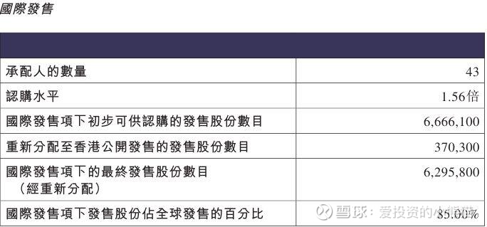 铜师傅(00664.HK)国际配售总共43人,认购额1.56倍。
