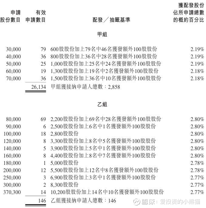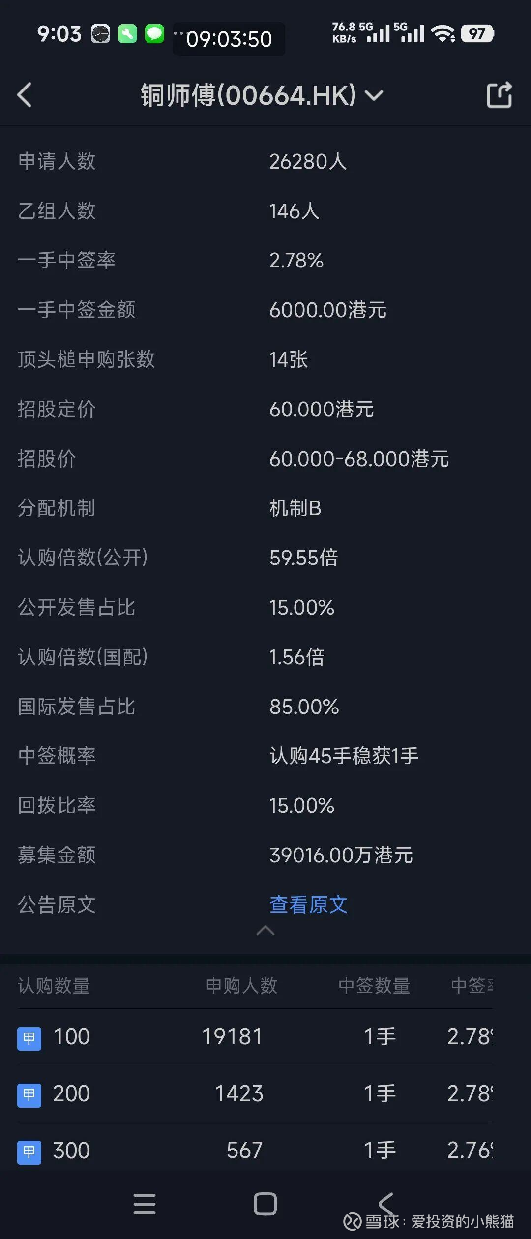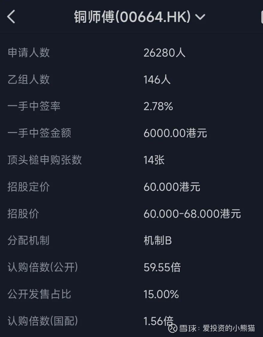 铜师傅(00664.HK)乙组官方披露的中签名单: