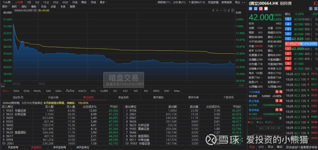 铜师傅(00664.HK)辉立暗盘以60.00港元平开,立马快速下探, 到最低点36.04港元企稳反弹,再震荡整理,尾盘以42.00港元报收,跌幅为30.00%,振幅39.93%,成交1500万港元。