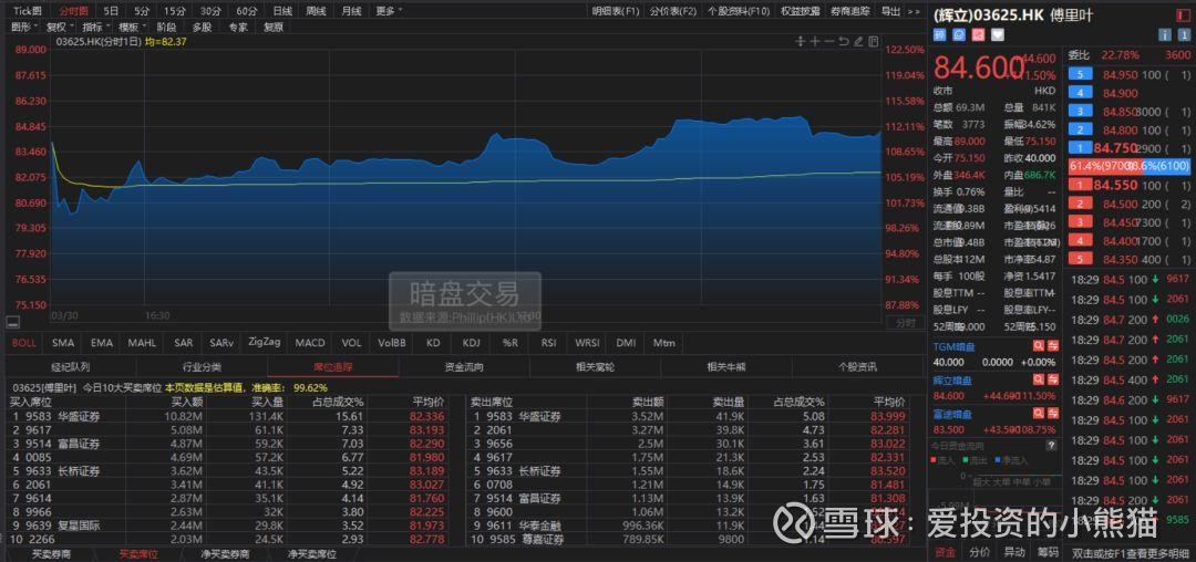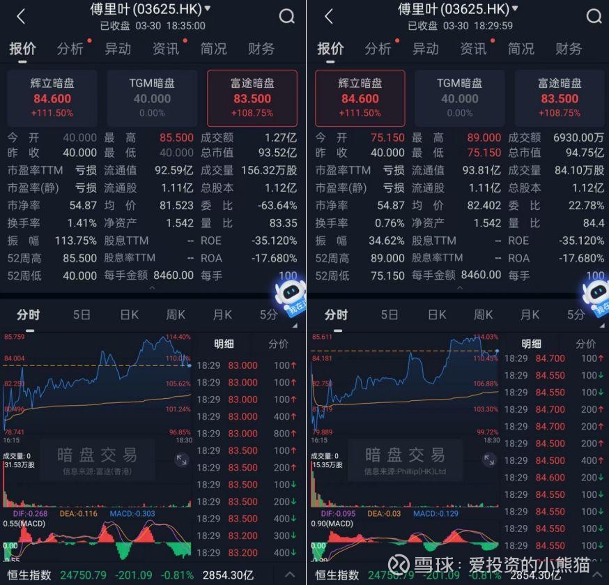 傅里叶(03625.HK)辉立暗盘以75.15港元高开,上冲一下又回落到80.00港元附近,之后又震荡上行,最高摸到89.00港元,尾盘稍有回落以84.60港元报收,涨幅为111.50%,振幅34.62%,成交6930万港元。