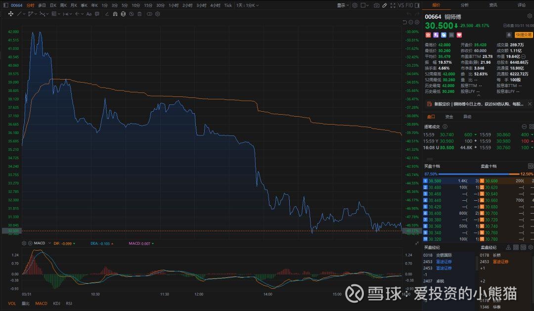 今天首日的表现,发行价60港元,首日开盘报35.42港元,较发行价低开40.97%;盘中未见显著冲高,尾盘收30.50港元,较发行价跌幅约49.17%;整体呈低开低走、显著破发态势,成交约1.11亿,市场情绪偏弱 。