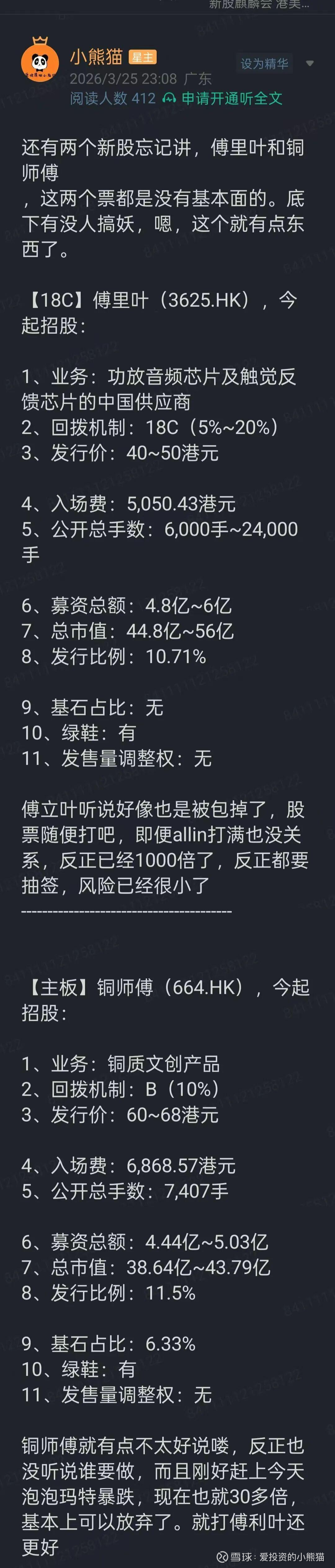 。但其中包含一条酌情条款,允许在公开发售和国际发售均获足额认购时,发行人可酌情将更多股份回拨给散户 。铜师傅的认购情况:香港公开发售:获得了59.55倍的超额认购 。国际发售:仅获得1.56倍的认购,显示出机构投资者的兴趣非常冷淡 。触发回拨:尽管初始方案“不设常规回拨”,但由于公开发售的