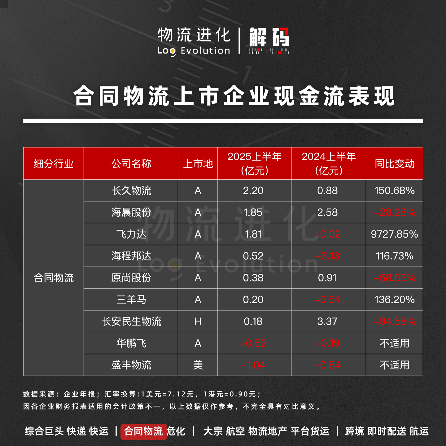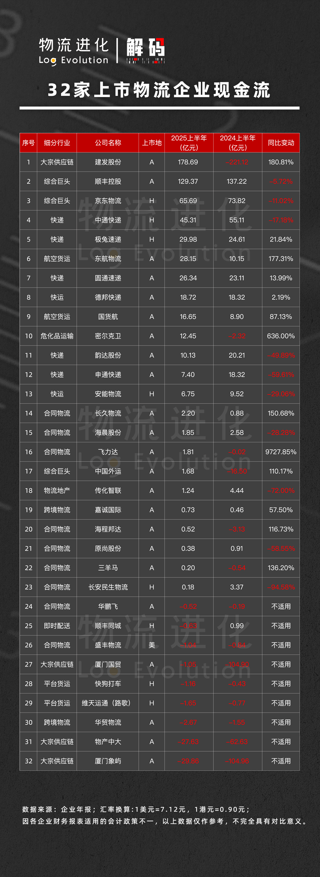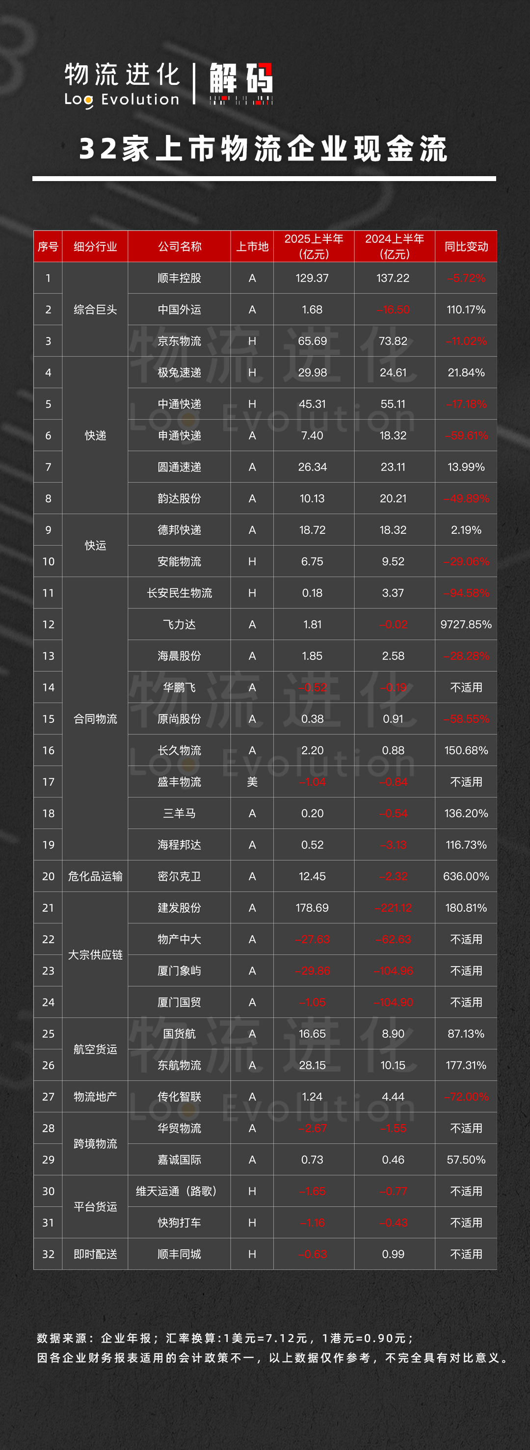 根据上市公司2025年中期报告数据,物流进化选取了11大细分物流赛道、共32家中国上市物流企业进行经营性现金流净额数据分析。各大物流企业的真实“造血”能力如何?谁最有钱?通过数据,我们一探究竟。