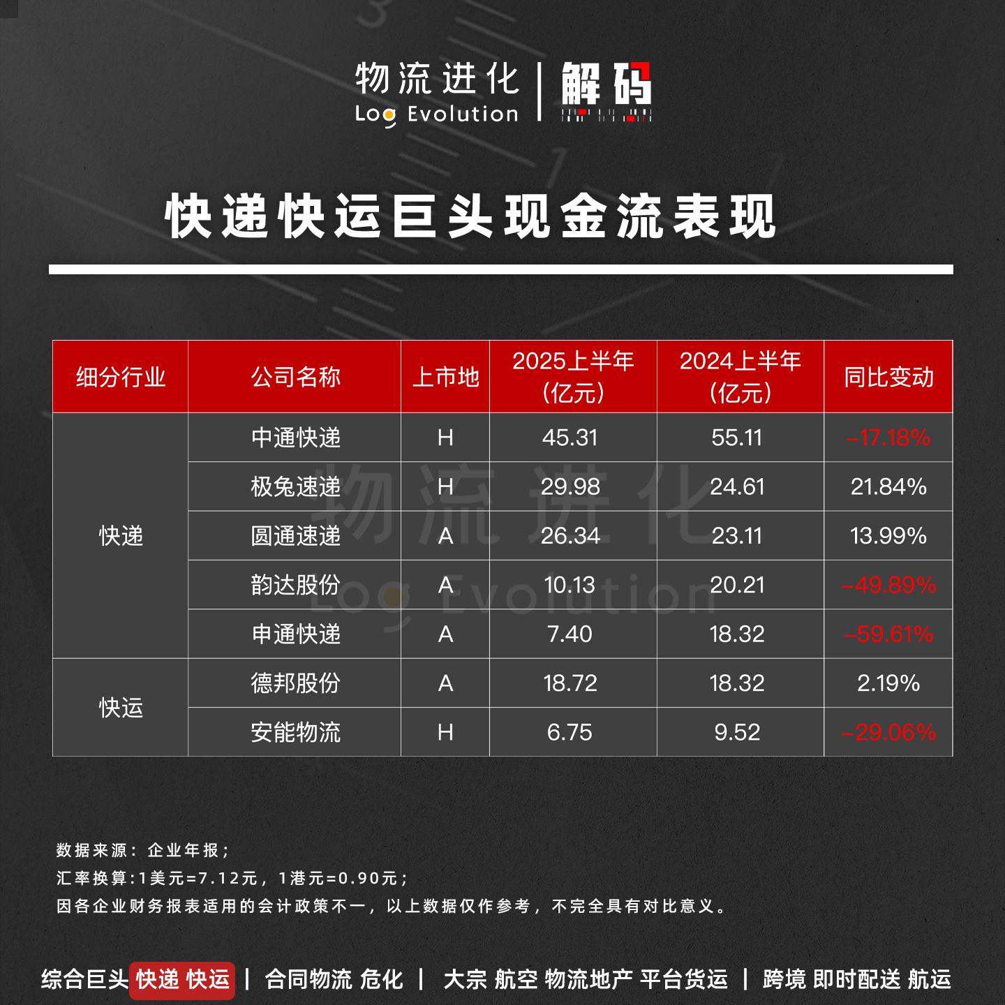 其次,快运企业中,德邦上半年的经营性现金流净额为18.72亿元,同比微增2.19%,金额在32家企业中排名第8名;安能物流的金额则为6.75亿元,同比下降29%,排名第13。