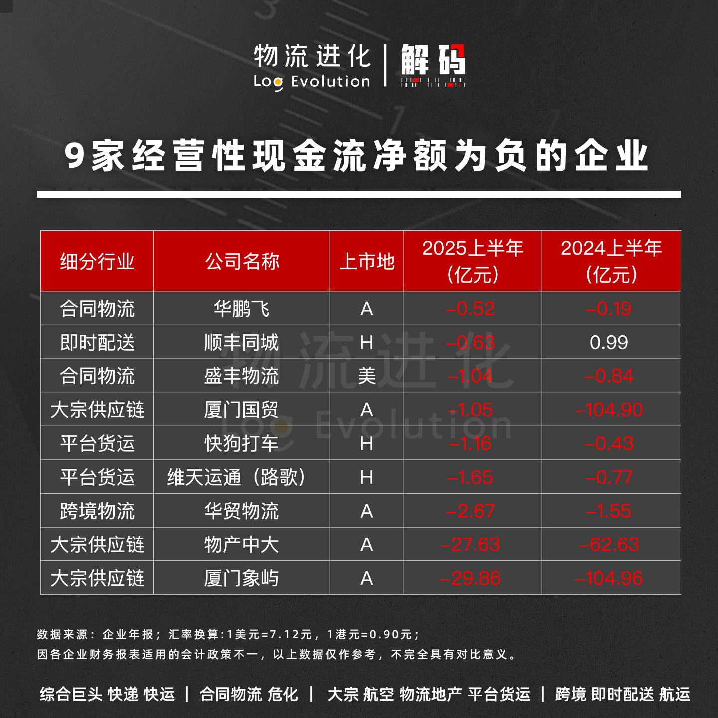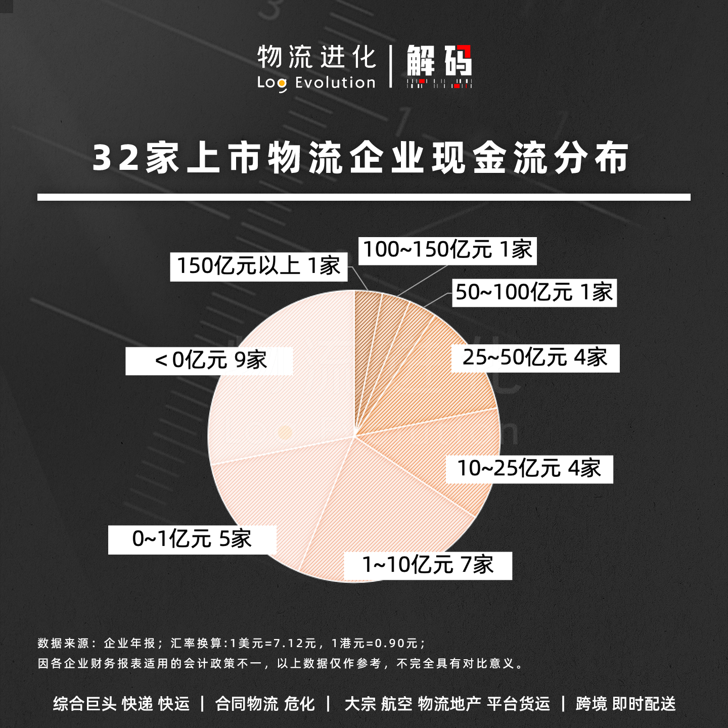 统计数据显示,这32家上市物流企业中,上半年经营性现金流净额为正值(现金流入大于流出)的有23家,总额达到586.42亿元;另有9家为负值,总额为-66.21亿元。