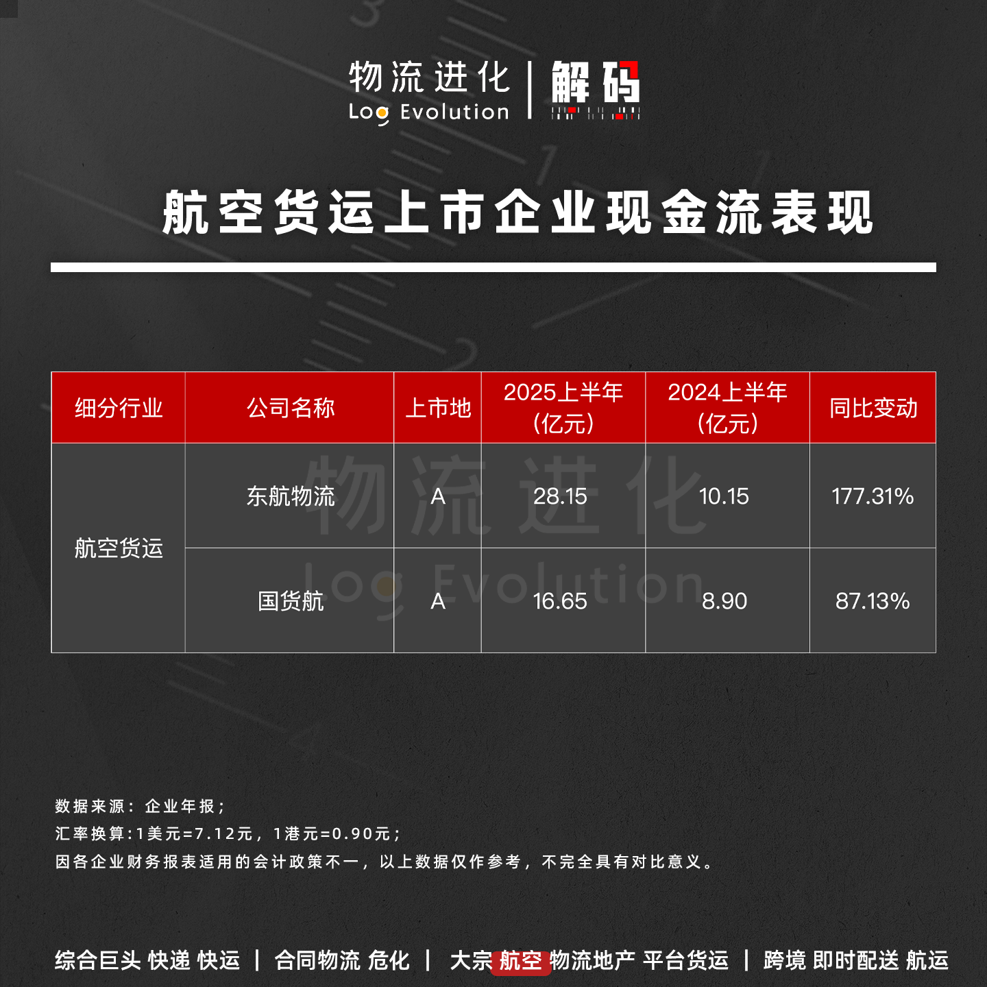 而综合现金流量表来看,其他与经营活动有关的现金收入方面,国货航和东航物流上半年都获得了超亿元的政府补助,分别为2.05亿元、1.82亿元,同比2024年同期增长243%、125%。整体来说,东航物流作为航空货运头部企业在核心资源布局和运营底盘上的实力更加强劲。