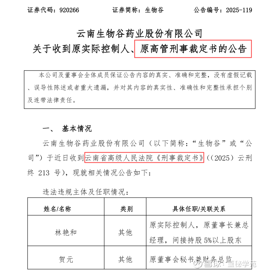 北交所上市公司生物谷近日发布公告收到原实际控制人、原高管刑事裁定书,主要涉及原实际控制人、董事长林艳和以及原董秘兼财总贺元。