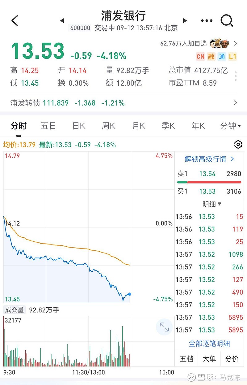 $浦发银行(SH600000)$ 浦发的可转债挺可惜的,今天的大跌基本上宣告强赎失败。浦发也不是没有努力,中报把净利润做到了+10%,还有信达帮忙买了117亿可转债。今年7月份,距离强赎价只有一步之遥。
