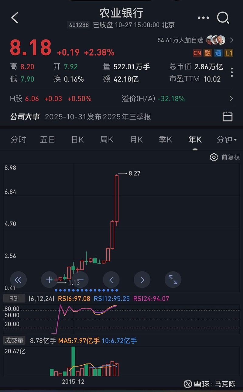 $农业银行(SH601288)$ 今天继续大涨,当前估值:PB达到1.06倍,股息率3%。农行过去三年涨幅:2023年上涨33%;2024年上涨55%;2025年上涨60%;三年累计上涨230%,太牛了:rocket:农行股价涨幅遥遥领先,率先完成了估值修复。