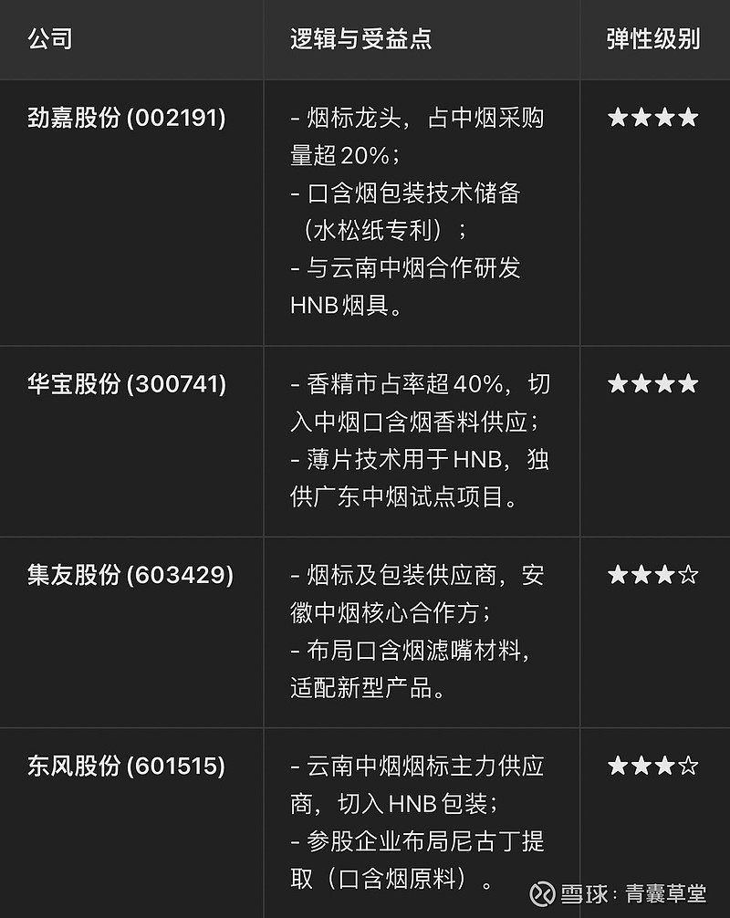 受益方:中烟供应链(包装/香精/烟标)、高端烟草原料供应商。