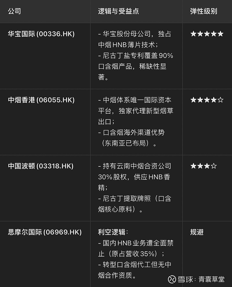 根据国家烟草专卖局2025年8月会议释放的三条政策方向(果味烟禁批、口含烟加速、HNB民营禁令),以下是对A股和港股核心受益上市公司的深度分析及影响逻辑: