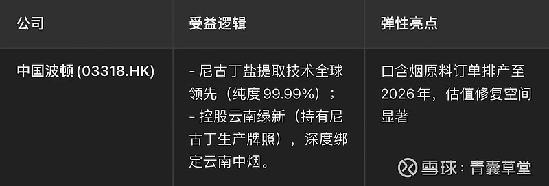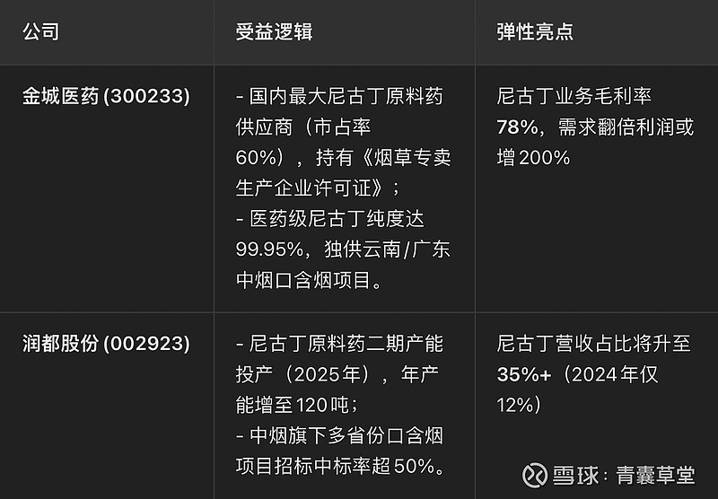 另外,尼古丁的原料公司也会受到极大的提升。因为供应高度集中:国内拥有尼古丁生产许可证的企业仅 3家(政策壁垒极高),供需缺口或引发涨价。