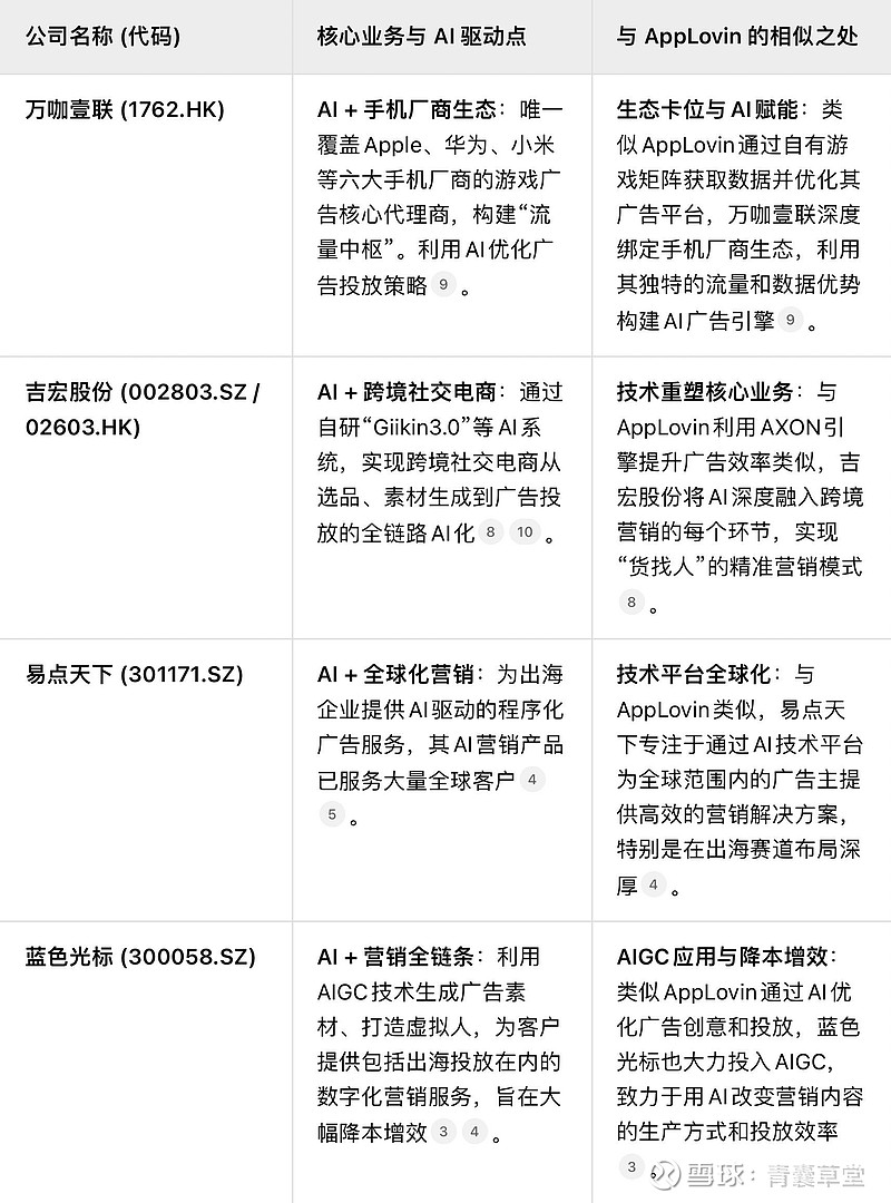 总的来说,虽然完全对标AppLovin的公司并不多见,但A股和H股市场中已涌现出一批在利用AI技术深度改造营销行业的积极探索者。