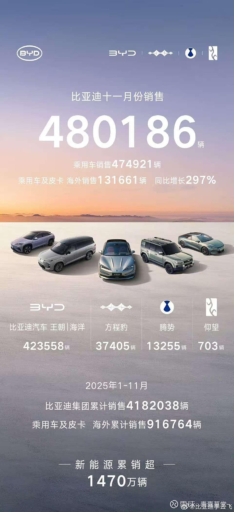 比亚迪在2025年11月实现131661辆的出口销量,与奇瑞的136,728辆已处于同一量级,差距微乎其微 。