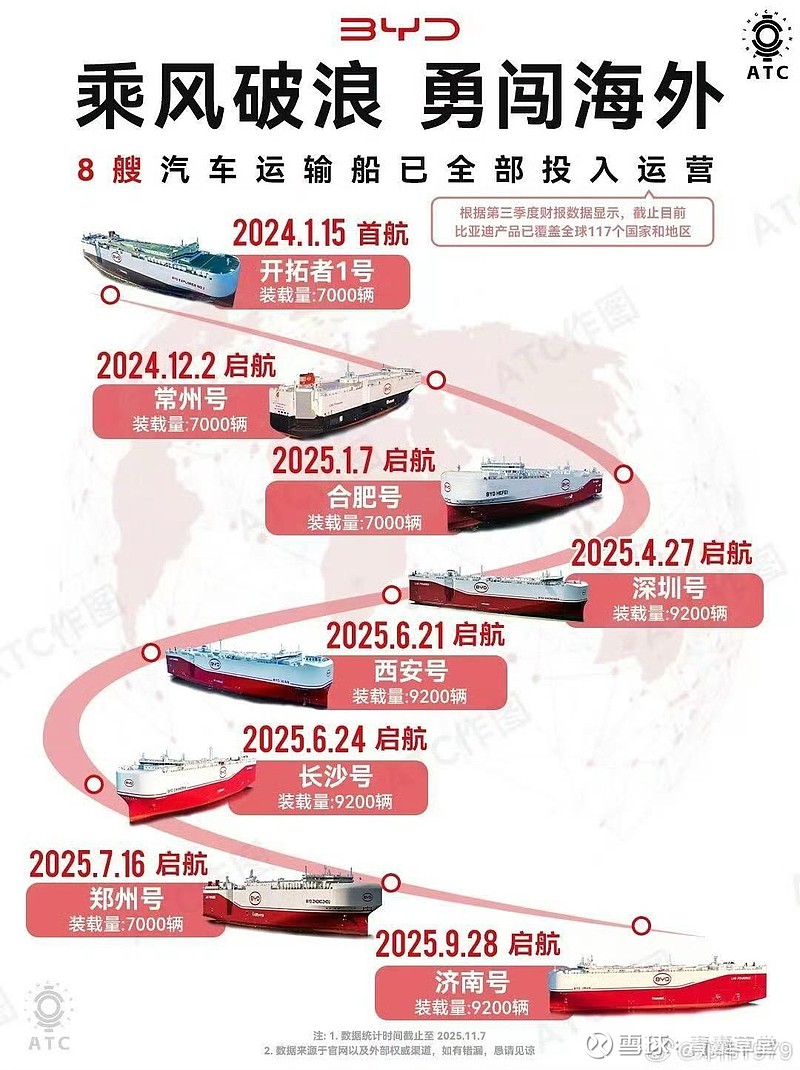 面对早年困扰中国车企出海的“运力瓶颈”和高昂运费,比亚迪选择了“国车国运”的硬核策略——自建船队。目前,比亚迪已拥有包括“BYD EXPLORER NO.1”、“深圳号”、“长沙号”在内的八艘专属汽车运输船 (号称比亚迪航母舰队)。这些巨轮有的单艘运力可达9200辆,采用先进的LNG双燃料清洁动力,不仅保障了运输的稳定性和时效性,更有助于显著降低物流成本,避免了在出口旺季被国际运力“卡脖子”的风险 。这套自主可控的物流体系,为比亚迪的海外扩张提供了坚实的基础保障。