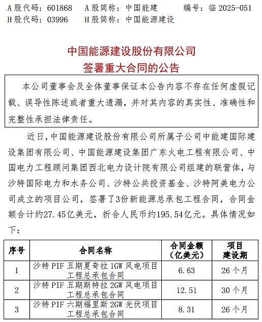 同日,中国能建所属联营体亦斩获大单,与由沙特国际电力和水务公司、沙特公共投资基金(PIF)、沙特阿美电力公司共同成立的项目公司,签署了3份新能源总承包工程合同,总金额高达27.45亿美元(约合195.54亿元人民币)。这批项目包括总装机3GW的两个大型风电项目和总装机2GW的一个大型光伏项目,建设周期在26至30个月之间。