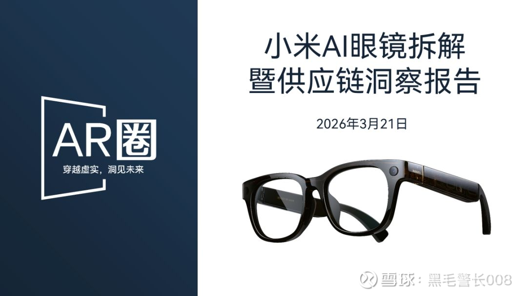 近期,『AR圈』对小米AI眼镜标准版进行了拆解。通过这次拆解,我们梳理了其供应链构成、核心硬件选型以及整体的工程设计思路,并输出了《小米AI眼镜拆解暨供应链洞察报告2026》。本文为报告的缩略版,重点呈现小米AI眼镜的核心器件供应链、设计不足及亮点。